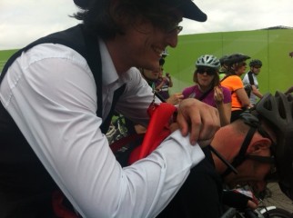 Egged on by Chris and the crowd, there was no way back for the poor guy. With Chris crouching very low over the handlebars, he somehow managed to complete his journey.