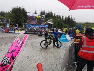 That was awesome – it was so cold and wet – and so slippery – but it was great to see all the Elite riders laughing and joking before their runs down. We then headed back down – we wanted to bag a prime spot at the end of the track, right in front of the big screen, so we could see the riders live on the final jumps section and their splits on their way down on TV. Well, what an experience. It was all over so fast, and what could possibly have been better than to see Rachel Atherton win on her home course. Buzzing!